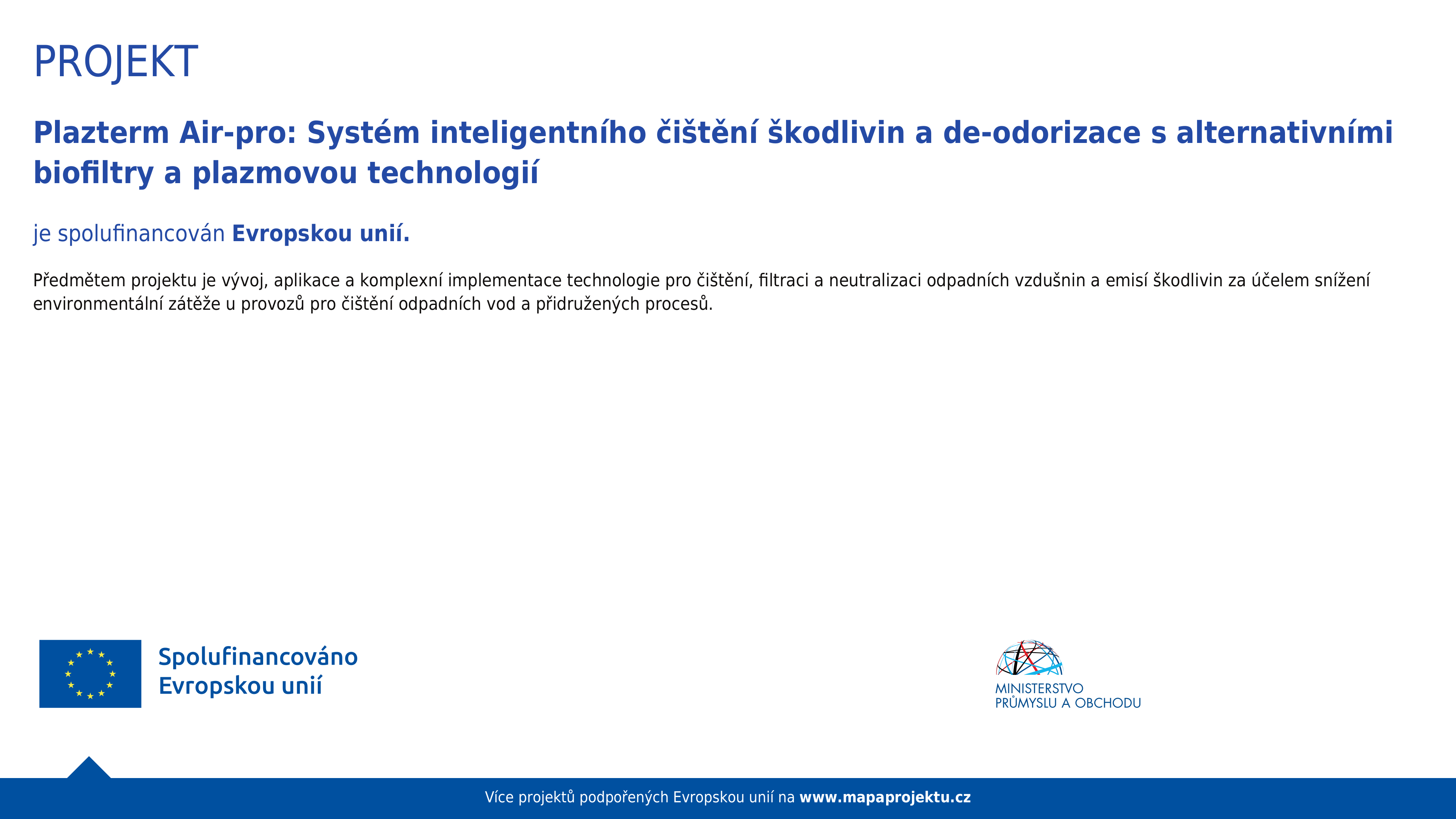 Předložený projekt se zabývá vývojem, aplikací a komplexní implementací technologie, která slouží pro čištění, filtraci a neutralizaci odpadních vzdušin a emisí škodlivin za účelem snížení enviromentální zátěže u průmyslového čištění odpraních vod a dalších technologických provozů a přidružených procesů. Záměrem je využití konceptu modulární plazmové technologie v kombinaci se speciálně navrženými selektrivními filtry, ve kterých se využije funkčních alternativních a recyklovaných materiálů vlastního designu, což má pozitivní efekt na snížení spotřeby jinak používaných neekologických náplní. Zapojení je také možné kombinovat do modulárních bloků, případně i dovybavit organickou sekcí. Zaměření je především na proces čištění a stabilizace kontaminované vzdušiny a procesních plynných emisí vznikajících v technologiích čístíren odpadních vod a dalších technologických provozů. Součástí řešení je také návrh zcela nového konceptu hlavního generátoru plazmatu pro filtraci.
